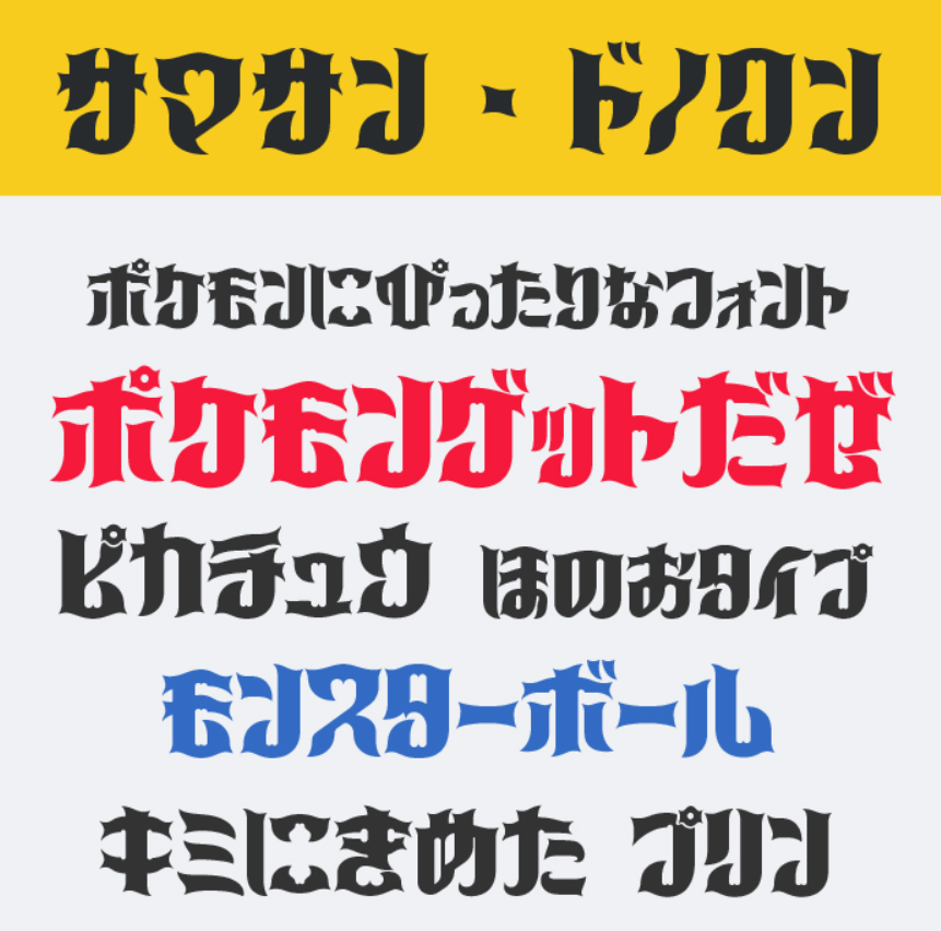 サマサン・ドノクンフォントは、ゴシック調で「ダークでカッコいい雰囲気」をもつデザインフォントです。カッコいいいタイプの悪タイプやドラゴンタイプなどのポケモンにハマりそうなフォントです。